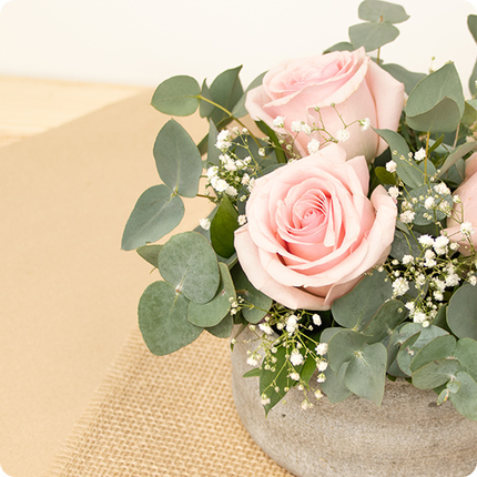 Succombez à la délicatesse intemporelle de l’arrangement floral Velours de rose, une création sobre et raffinée mettant à l’honneur la beauté pure de la rose rose poudré. Composé avec trois magnifiques roses entourées de feuillage d’eucalyptus et de gypsophile, cet arrangement piqué séduit par son minimalisme élégant et son message tout en tendresse.