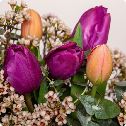 Apportez fraîcheur et modernité à votre intérieur avec le Bouquet Éveil de Tulipes. Cette composition lumineuse marie harmonieusement les tulipes violettes et orangées à la délicatesse des petites fleurs de wax blanc.