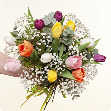 L'harmonie de ce bouquet repose sur un mariage subtil : la rondeur naturelle des tulipes s'allie à un feuillage aérien choisi pour sa finesse. Il en résulte une composition équilibrée, mêlant élégance intemporelle et légèreté végétale.