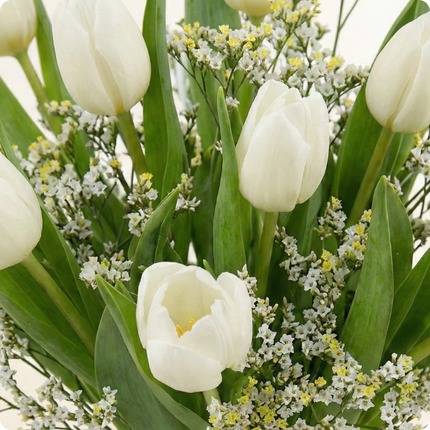 Bouquet simple de tulipes blanches avec feuillage et petites fleurs blanches