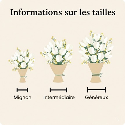 Ce bouquet incarne la simplicité noble de la tulipe blanche : pureté, paix et délicatesse. Une attention parfaite pour témoigner d’une affection sincère, d’un soutien ou d’un message sobre et lumineux. Chaque bouquet reflète le geste expert du fleuriste et son regard sur l’harmonie florale.