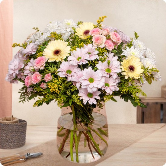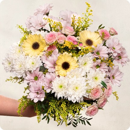 Élégant et lumineux, le Bouquet Luméa est une ode à la douceur florale. Sa composition tendre associe des gerberas crème, des chrysanthèmes pastel, de délicates petites roses roses et une touche de feuillage frais. Avec ses teintes poudrées et sa structure aérée, il illumine les intérieurs avec grâce et simplicité.