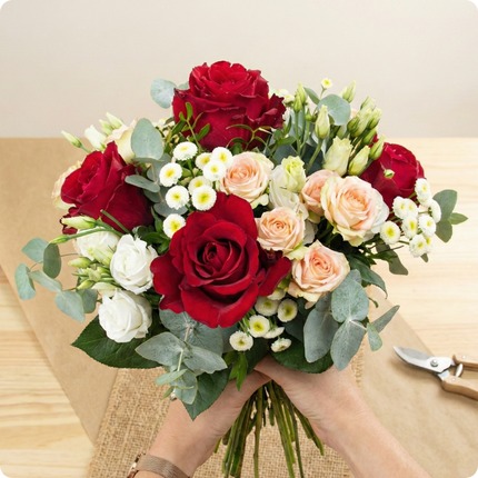 Le Bouquet Opéra est une composition florale sophistiquée qui allie la passion du rouge, la tendresse du rose et la pureté du blanc. Il est composé de roses rouges veloutées, de roses branchues pastel, de lisianthus blancs délicats, et de petits chrysanthèmes lumineux, sublimés par un feuillage d’eucalyptus apportant fraîcheur et légèreté.