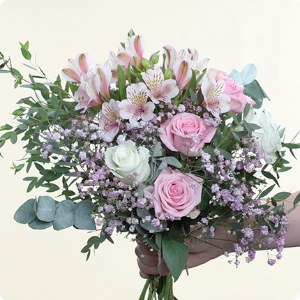 Pour ce bouquet, vos fleuristes ont imaginé une composition qui joue sur la verticalité et le contraste des matières. L’artisan marie des roses aux teintes poudrées et immaculées avec des alstroemerias striés, créant un rythme visuel à la fois doux et captivant. L’ensemble est sublimé par un nuage de gypsophile teinté de mauve et de larges branches d'eucalyptus, qui apportent cette silhouette libre et indomptée propre aux jardins de l'artisan. C’est une pièce pleine de caractère, montée pour offrir un volume généreux et une sensation de nature brute et élégante.