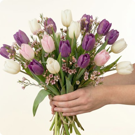 Bouquet de tulipes blanches, roses et violettes avec du wax