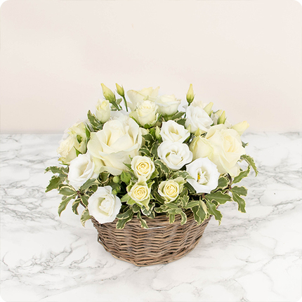 Composition florale pour deuil composée de roses blanches et de petites fleurs de saison, ornées d'un feuillage délicat. Colombe saura accompagner vos messages de condoléances et de soutien de la plus douce des manières.