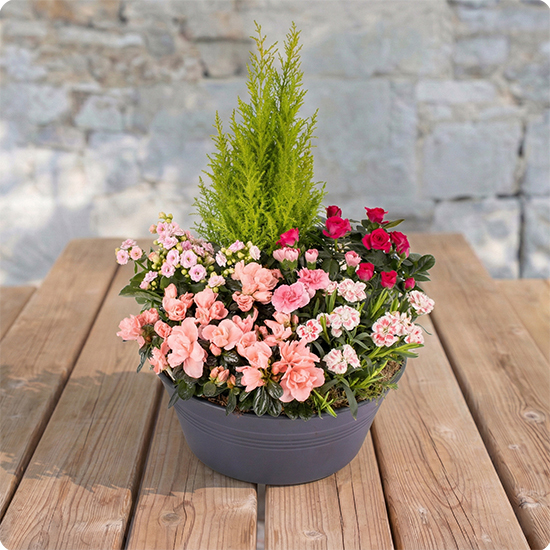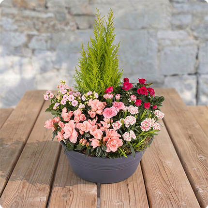 Constituée de végétaux et de plantes fleuries dans des teintes roses, délicates et réconfortantes, cette composition florale saura transmettre vos messages de condoléances avec élégance pour un dernier hommage emprunt de tendresse et de douceur.
