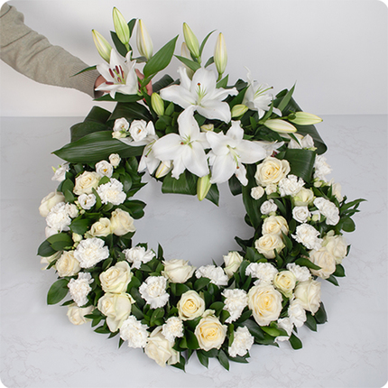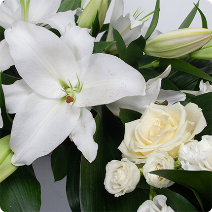 Le lys blanc, symbole de pureté et d’élévation spirituelle, s’associe aux roses crème, pleines de tendresse, pour évoquer des souvenirs lumineux et sincères. Parfaite pour les cérémonies d’obsèques, cette couronne florale offre une présence forte et délicate, portée par une composition soignée et respectueuse.