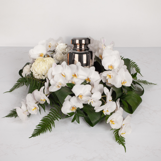 Offrez un dernier adieu tout en finesse avec la couronne Tendre adieu. Cette création florale raffinée entoure délicatement une urne funéraire, dans un esprit de paix et de sérénité. Les orchidées blanches, symboles d’éternité et de pureté, se mêlent aux feuillages graphiques et aux fleurs blanches pleines de douceur pour composer un hommage sobre, lumineux et profondément respectueux.