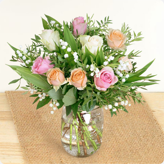 Laissez-vous envoûter par la tendresse de cette création artisanale aux nuances pastel. Ce bouquet est une véritable caresse visuelle, mariant la subtilité de roses aux tons pêche et crème à la finesse incomparable du Muguet Nantais.