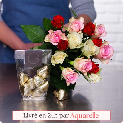 Offrez ce charmant bouquet de roses qui mêle les variétés “Red Calypso”, “Akito” et “Lovely Jewel”. Succombez au charme de cette brassée romantique aux teintes délicates, parfaite pour déclarer sa flamme avec élégance. Pour l’accompagner, découvrez un sachet de 8 cœurs en chocolat, garnis d’une ganache intense au chocolat, pour une touche gourmande pleine d’émotion.