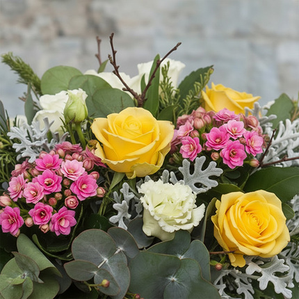 Réalisée avec un mélange équilibré de fleurs de saison et de plantes, cette création offre un rendu naturel et délicat. Les feuillages apportent du volume et mettent en valeur les fleurs pour créer une composition florale pleine de sens et de douceur.