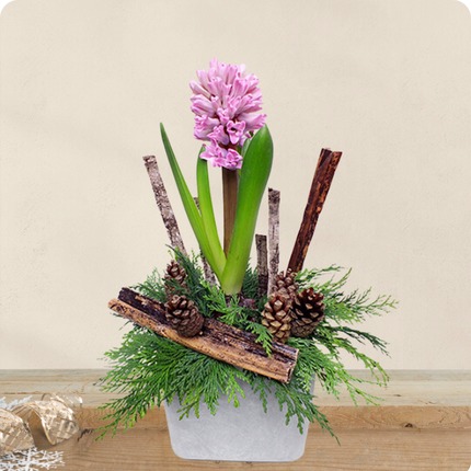Célébrez la magie de l’hiver avec l'arrangement de jacinthes d’Hiver, une composition florale raffinée et parfumée qui invite à la rêverie. Ses délicates jacinthes blanches, mises en scène dans un élégant contenant en métal, évoquent la pureté de la neige fraîche et la douceur de la saison. Associées à quelques éléments naturels comme les pommes de pin et la mousse, et rehaussées de petites boules dorées, elles forment un tableau chaleureux, parfait pour décorer la maison pendant les fêtes ou offrir une attention parfumée et élégante.