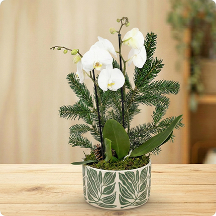 La Sublime incarne l’alliance parfaite entre la grâce d’une orchidée blanche et la magie des fêtes de fin d’année. Dans cette création raffinée, l’élégance de la Phalaenopsis s’épanouit au cœur d’un décor végétal hivernal ponctué de notes rouges éclatantes.