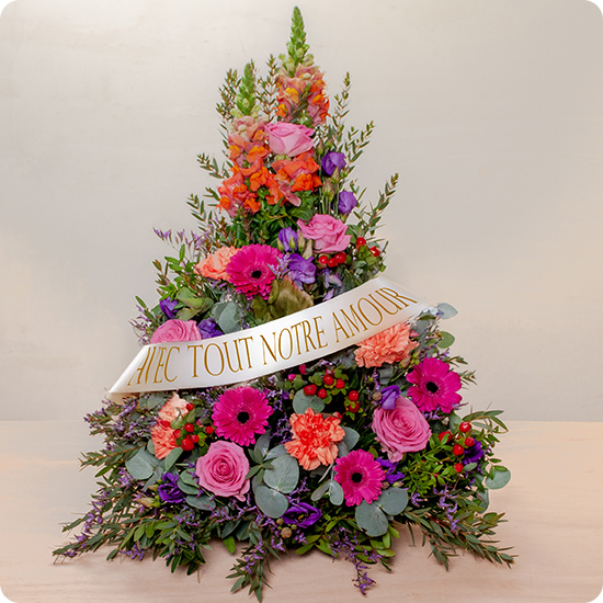 Célébrez la mémoire d’un être cher avec la pièce de deuil Envol en couleurs, une composition florale majestueuse et pleine de lumière. Réalisée dans des tons éclatants – rose, violet, orange, corail – cette création verticale exprime un dernier adieu empreint d’amour, de reconnaissance et d’espoir.