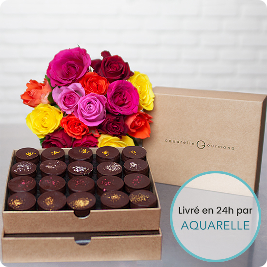 - 44 € : 220 g de palets noir intense (20 chocolats) + 1 bouquet de 15 roses